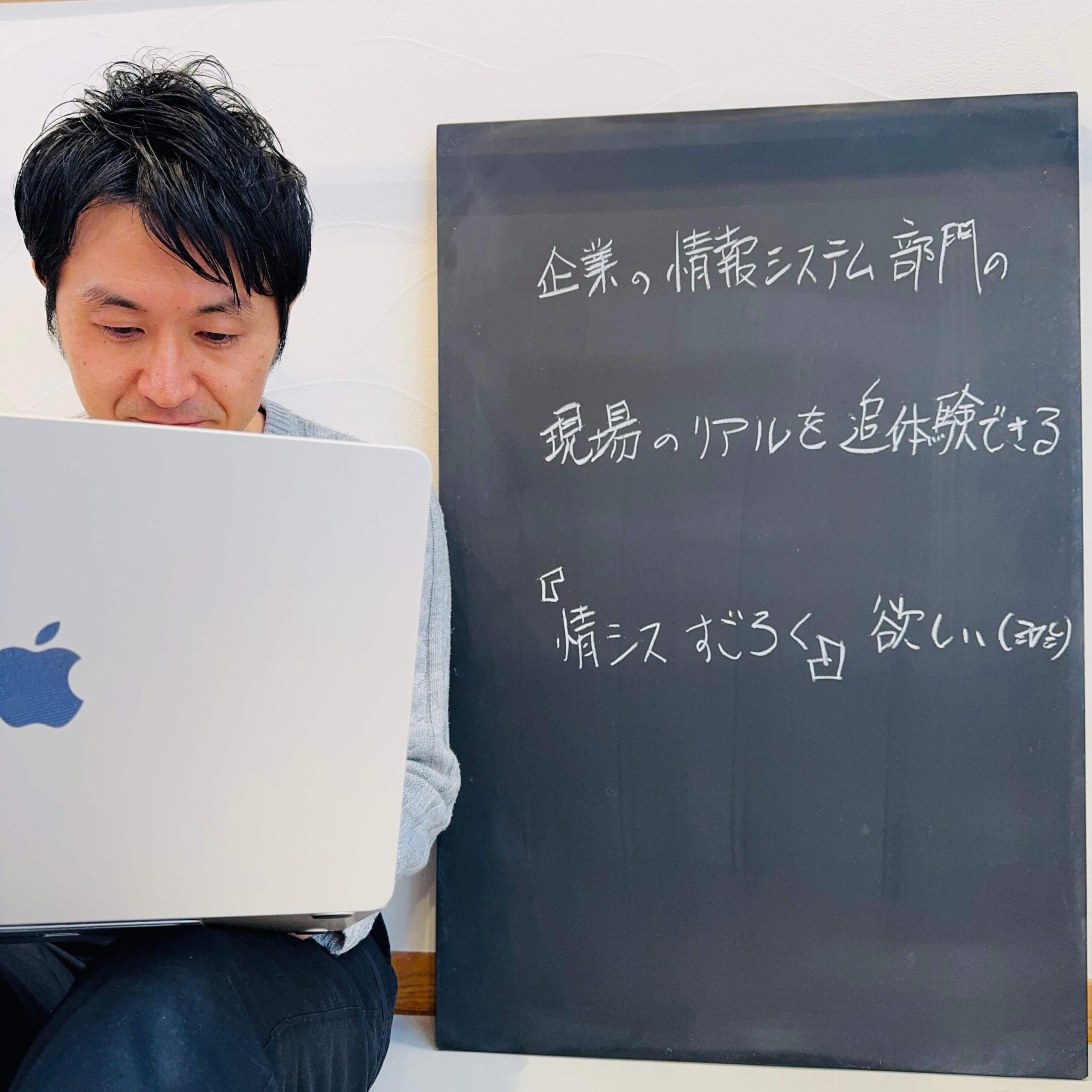 黒板に書いたのは、HENNGE株式会社さんが制作した、情シス現場をゲーム化した画期的なボードゲームの話です。